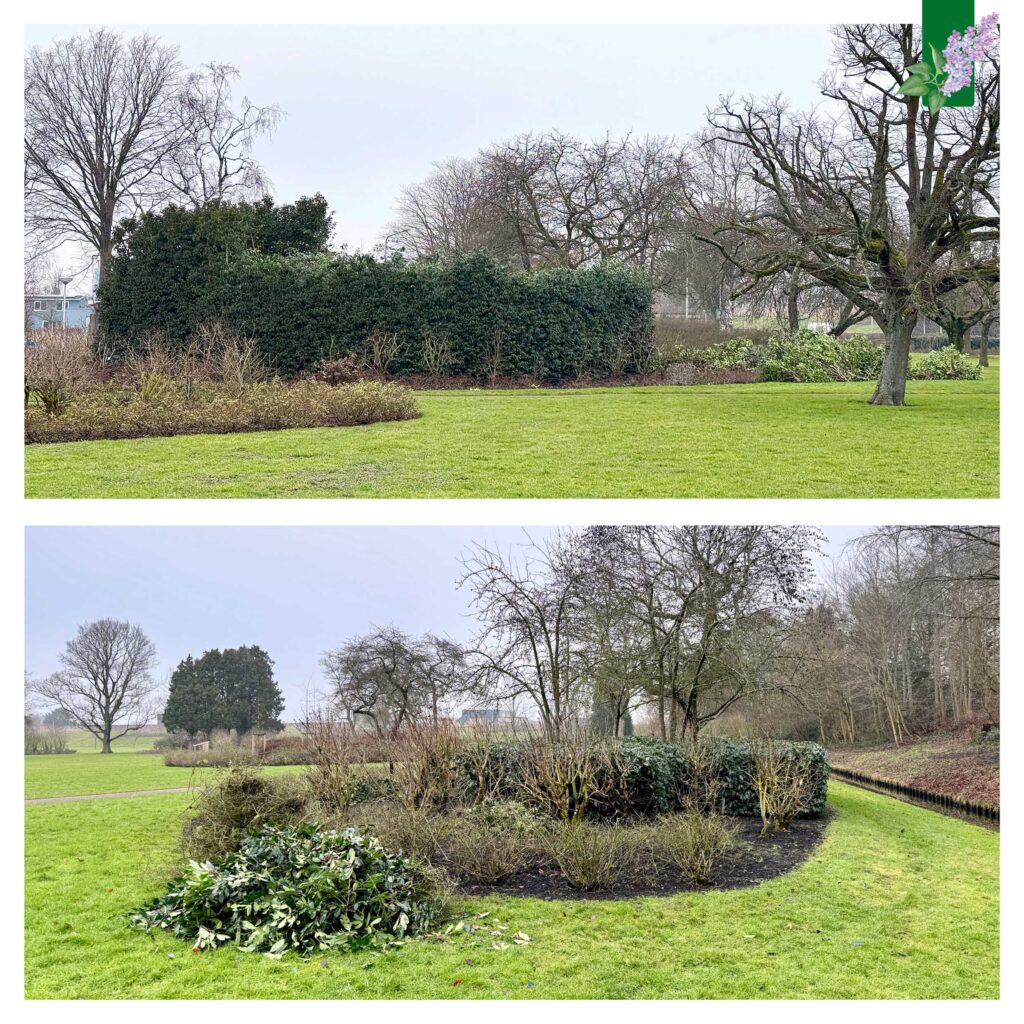 Deze wintergroene struik kan wel 7 meter worden. Door nu te snoeien en het geheel smaller te maken krijgen de seringen en andere planten straks weer de ruimte en meer licht. Binnen de groep zijn de struiken kaal maar die lopen makkelijk weer uit.