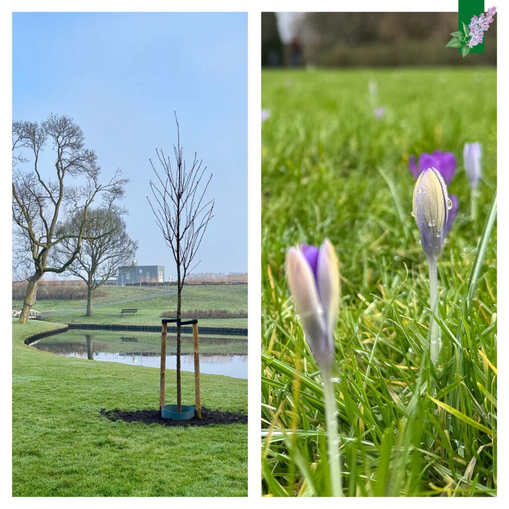 Ook is de laatst vernielde Prunus serrulata ‘Kanzan’ (Japanse sierkers) door de gemeente herplant en de eerste krokusjes komen voorzichtig tevoorschijn. Daar worden we blij van!