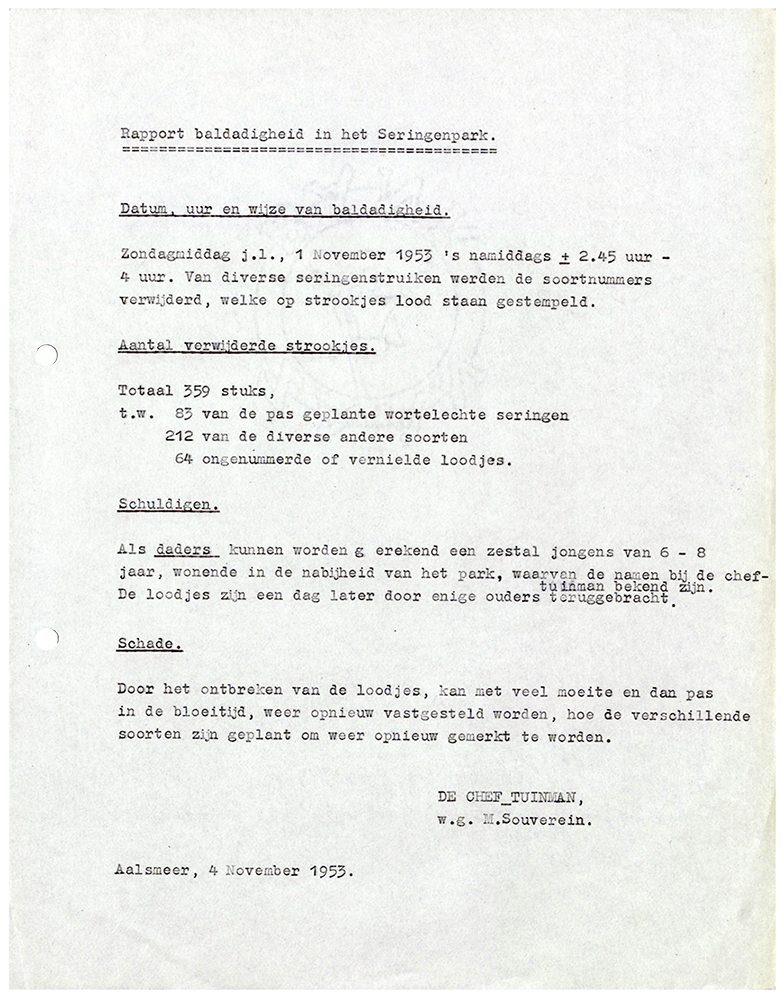 Paaltjes kunnen omvallen, bandjes verdwijnen en mensen maken fouten. Als de ringen met nummers ontbreken dan kan pas in de bloeitijd –met heel veel moeite– de variëteit opnieuw vastgesteld worden. Zie bijgaand document uit 1953, toen jonge kinderen uit baldadigheid de ringen weggenomen hebben uit het Seringenpark. Bij sommige variëteiten was niet meer te achterhalen om welke sering het nu precies ging. Er zijn toen veel bijzondere variëteiten uit binnen- en buitenland verloren gegaan.